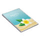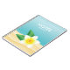 Destei's illustration of a white frangipani plumeria flower with green leaves. The background colour is blue with sand texture on the bottom. There are personalizable text areas for the title of the notebook.