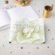 This guest book is shown in an up-close large soft white gardenia image photo print on front. Personalized names and wedding date shown in soft blue. Backside has a same large gardenia image along with personalized names and date near bottom.