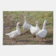 A gaggle of white geese in the farmyard in fall.