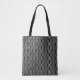 This tote bag has a geometric design of sort of flat-ended ovals repeating across the design in white on a field of black.
