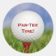 Close up of a white golf ball on a red tee in the grass with sky background for birthday gold theme.