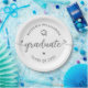 Be proud, rejoice and showcase this milestone of your favorite grad! Celebrate with these simple, modern, bold custom paper plates. Fun soft gray handwritten calligraphy script with cute, playful hearts and a graduation cap icon overlay a clean, white background. Personalize the custom text with your graduate’s name and class year or special message. Available in 2 sizes: 7” or 9”, round or square. Matching invites, thank you cards, hand fans, banners, yard signs and other graduation goodies are also available in this trendy and playful collection. Guaranteed to add stylish fun to their special party!