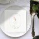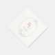 Elegant and chic. These lovely wedding napkins excude a youthful freshness. Couple initials in a coral-pink colour set inside a delicate floral green frame. Couple names and date are expressed in a rich dark forest green colour against a white background.