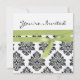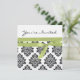 design has an elegant black damask Pattern against a white background with a faux green ribbon. The reverse of the card has a cute little rhyme. All text is fully customizable. you can also alter the background colour of the card by clicking on 'customize' and then 'colour'. invitation is shown here in a linen finish. other finishes are available!