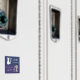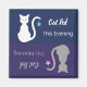 A reminder to feed the cat and let others know that the cat has been fed. Simply turn the magnet around when the cat has been fed in the morning or evening. The evening side has a white cat with a blue star hanging from their tail. The morning side has a grey cat with a pink star hanging from their tail. The background is blue and purple.