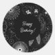 A decorative sticker design with a geometric floral pattern, featuring stylized versions of a selection of flowers including: Japanese anemones, daffodils, violets, pansies, daisies, roses, Michaelmas daisies, cinquefoils, primroses, buddleia, clematis, gardenia, phlox and forget-me-nots. The print is white lines over grey lines on a black background. Change the default "Happy Birthday!" text if desired. Matching wrapping paper, tissue paper, gift bags and gift tags are available in the PatternPie store.