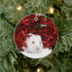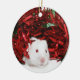 Red eyed white hamster peeks out from red Christmas garland photo holiday ornament