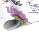 This magical Halloween wrapping paper features a white background with adorable illustrations, including a witchy white cat on a broom, spooky cupcakes, a pink octopus, and playful “Hocus Pocus” lettering. The whimsical design filled with stars and charming details makes it perfect for wrapping Halloween gifts and party favours with a fun, enchanting vibe.