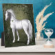 A white horse stands in the Enchanted Forest, surrounded by brightly coloured hummingbirds in this fantasy digital artwork by artist Jayne Wilson. Both horse lovers and fantasy art enthusiasts will enjoy this artwork.