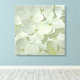 A pretty canvas featuring a soft image of beautiful white Hydrangea blossoms. This is a dry-brushed photo; lovely in white with pale accents of green and yellow.