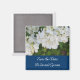 Beautiful white hydrangeas with dark green foliage accent this elegant save the date. A navy blue border accents names and wedding date. Customize as desired.