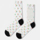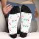 White knee-high socks with black heels and toes feature a colorful confetti pattern of small triangles and stripes. The design creates a playful, vibrant look.