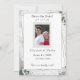 White Lace and Rose Leaves Wedding Save the Date design features your photo framed in centre with your information displayed against a white backing. Background features the image of white lace. Green rose leaves are delicately positioned at the corners. Reverse features a white background with a single sepia rose displayed at bottom right corner.