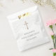 First Holy Communion design, featuring a gold crucifix and lace effect on white. Ready for easy personalization.