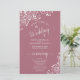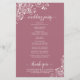 These wedding programs are elegant and tasteful, while still being budget friendly. The design features an ornate white floral lace pattern on a rose blue or mauve pink coloured background. The typography features lacy script calligraphy, and there is room for details on the ceremony, the bridal party, and a short thank you.