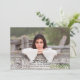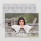 Chic graduation announcement, with custom photo placement covering the front, of the card, and graphics of white lace, across the bottom and covering the back. Black text is ready to personalize to suit your graduation needs. Model sample photo courtesy of Lorri Lang.