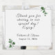 White Lace and Rose Leaves design features your text displayed against a white backing. Background features the image of white lace. Green rose leaves are delicately positioned at the corners. Reverse features a white background with a single sepia rose displayed at bottom right corner.