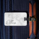 This design features personalized name in grey modern handwriting script font on white marble background.