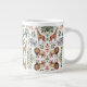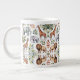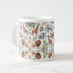 White mug featuring a vibrant jungle animal pattern, including elephants, giraffes, zebras, and lions, surrounded by green leaves on a marble surface.