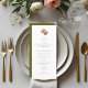 Stylish and chic with minimalist appeal. This wedding menu features a lovely floral rose bouquet alongside a contemporary set of fonts in olive green, against white and olive backrounds.