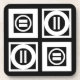 Bold geometric pattern features four white squares with space between them on a black background. The diagonally opposed thick squares each contain a thin white circle with a thick equal sign inside. In contrast, the thin squares each contain a thick white circle that touches the square’s edges with a thin vertical equal sign inside.