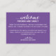 This charming white text on purple welcome card, placed in your welcome bag or basket in their accommodation, is a nice way to thank your out of town guests for the travel they needed to do to get to your wedding.