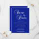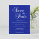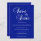 Minimalist wedding save the date with a fancy decorative script calligraphy in white on royal blue.