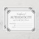 Elegant certificate of authenticity flat card in dark grey and white to which you can add your name or business name inside an ornate vintage-inspired frame. White certificate of authenticity flat card with elegant frames and fonts.