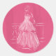 A sketch of a woman in a beautiful gown in white against a brushed pink background.