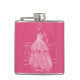 A sketch of a woman in a beautiful gown in white against a brushed pink background.