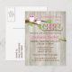 This white owl baby shower invitation has a momma owl and baby with chevron print and polka dots in pink and white. The wording "girl" has chevron, plaid, polka dots and scroll prints in pink, lime green and white. The background is a graphic barn wall and this postcard invitation has wording to be changed on front and back.