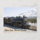 Old-fashioned train travelling through the White Pass to Skagway, British Columbia with a snow covered mountain in the background. Reprinted on this postcard.