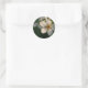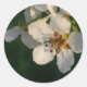 Close-up photograph of a white pear blossom with red anthers. On a round sticker, perfect for use as envelope seals.