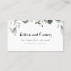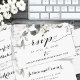 A subtle white wedding invitation featuring a delicately painted watercolor of white peony florals and eucalyptus greenery with a black swashed calligraphy font duo for this online RSVP.
