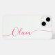 White Pink Elegant Calligraphy Script Custom Personalized Name iPhone 14 Smart Phone Cases features a modern and trendy simple and stylish design with your personalized name in elegant hand written calligraphy script typography on a white background. Designed by ©Evco Studio www.zazzle.com/store/evcostudio