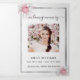 An elegant tri-fold program. A white background, a faux silver frame, pink and white florals and space for a photo. Personalize and add name, dates and your text.