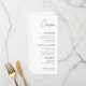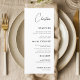 Minimalist white menu with a custom script guest name, designed to serve as both a place card and dining guide. Perfect for weddings, rehearsal dinners, bridal showers, or engagement parties, this versatile card combines personalization with modern elegance. The black-and-white layout and chic typography create a timeless, stylish detail that enhances table settings for any sophisticated celebration.