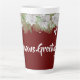 Beautiful top border garland of watercolor white poinsettias and other seasonal foliage on cranberry red background with white customizable text.