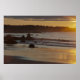 A colour photographic image of White Point Beach taken around sunrise featuring the warm glow of the rising sun on the wet sand of the beach and rays of light illuminating the big rocks along the shoreline . White Point is located on the south shore of the Atlantic Canadian province of Nova Scotia which is on the east coast of the North American country of Canada.