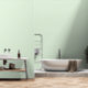 White polka dots on pale milky jade green pattern peel and stick wallpaper.