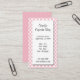 A custom business card template with script and friendly serif letters for your name, address, days and hours and more info on a clean white background with a drop shadow against a white polka dot pattern on red. Change fonts, add your own logo and more, even save your design for later.