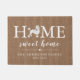 Personalized home sweet home door mat featuring a white poodle dog, with your family name & year established, set on a brown burlap look background