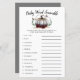Rustic pumpkin theme baby shower baby word scramble game card featuring illustration of a white pumpkin with faux gold glitter. The list of words on this card are all related to babies and they are scrambled. The guests are going to compete who can unscramble all of them first! ANSWER KEY: 1. car seat 2. milk 3. playpen 4. pacifier 5. diaper 6. rocking chair 7. nursery 8. baby monitor 9. swaddle 10. formula 11. rubber ducky 12. stroller.