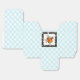 Square classic-style blue and white chequerboard favour box with a vintage image of Alice in Wonderland's white rabbit in full regalia in a black-and-white Wonderland frame. See the entire Wonderland Favour Box collection in the PARTY FAVORS section.