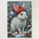 This soft, photorealistic airbrush illustration captures a tranquil white Rabbit, wearing a snug knit Santa hat, sitting perfectly still amidst lush pine boughs and red winter berries. A serene and peaceful holiday design.