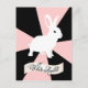 White Rabbit with white rabbit text banner underneath and black and pink ray background.