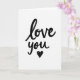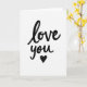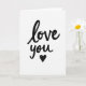This greeting card features the words “love you” written in bold black brush lettering across a bright white background. The letters have smooth curves with natural changes in ink weight, creating darker and lighter areas that give the message a hand-written feel. The text is centered and large, so it becomes the main focus right away. Just below the words sits a small black heart drawn with an open, slightly uneven line, adding a soft, personal touch. The wide white space around the lettering keeps attention on the message itself and gives it a calm, intimate feel. The simple black-and-white look makes the card feel sincere and close, like a short note meant just for one person. It’s an easy, heartfelt way to say “love you” to a partner, close friend, or anyone special on Valentine’s Day or any time you want to share affection.