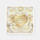 Lovely floral 50th Wedding Anniversary paper napkins with a profusion of white roses. Overlay is an ornate golden heart. Gold text art says 50th Wedding Anniversary. Lower text area is ready to be customized by you.with names and date information