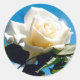 White rose under blue sky. Vibrant photo of a beautiful blooming rose makes a great floral wall art gift. The calm beauty of white rose reflects new beginnings, purity,loyalty and innocence. White roses symbolize the young love that the bride has for her spouse. White roses also symbolize the foundation of a relationship, which is why they are often seen on a wedding day. The white rose is a traditional wedding flower. White rose is a fitting flower for celebrating a new romantic and marital bond.