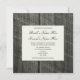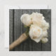 A wedding invitation featuring a photo of a bouquet of white roses with stems wrapped in burlap twine over a background of barnwood. Personalize with details of yoru occasion on opposite side, which also features barnwood background.